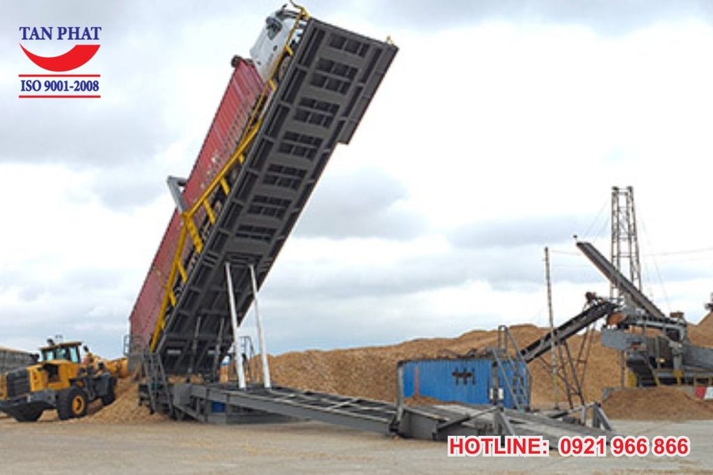 Bàn nâng đổ dăm gỗ là dòng bàn nâng container chuyên dụng với nhiệm vụ chính là nghiêng thùng xe chở dăm gỗ, hàng hóa từ đó sẽ được đổ nhanh chóng, an toàn vào bồn chứa hoặc băng chuyền.