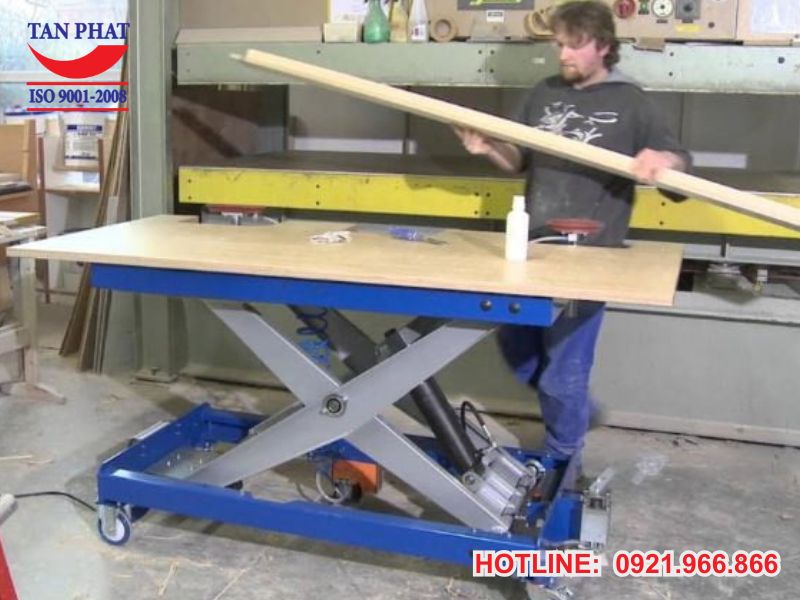 Bàn nâng gỗ thủy lực di động: Thiết bị được trang bị hệ thống bánh xe giúp di chuyển bàn nâng dễ dàng, tiện lợi trong xưởng gỗ. Bàn nâng có thể sử dụng kết hợp với đa dạng các thiết bị, máy móc khác nhau giúp tối ưu hiệu suất làm việc cũng như tiết kiệm chi phí.